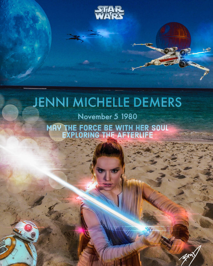 8. The graphic digital drawing above is what I would like to perceive Jenni’s soul exploring the Cosmic Universes like the fictional, Jedi Rey Skywalker of the Star Wars saga. If Jenni had a chance in life, what would have she achieved?