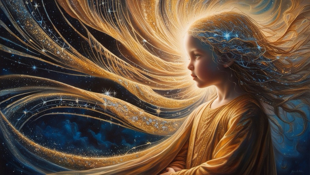 Instead of darkness, Christine’s awareness soared. She was pulled into an everywhere, shimmering web of pure energy, a place of quiet understanding – The Cosmic Dreams. Time didn’t seem to exist here. After what felt like forever, her spirit became solid again, settling into a new body on a faraway world. She was born as Lyra, a beautiful baby girl on Valarian 4, a bright planet under sapphire skies, circling twin suns. Her new body was graceful, with long arms and legs, and eyes that glowed with a gentle light, just like all her new people.